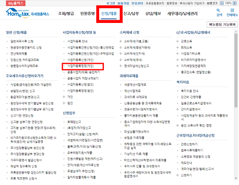 3. 사업자등록신청/정정 등 목록에서 사업자등록정정(개인) 클릭
