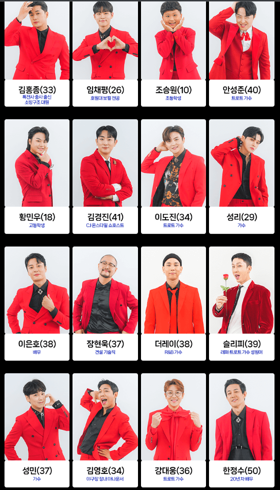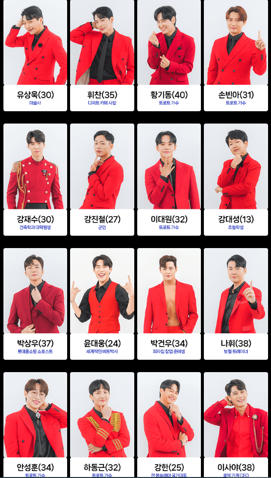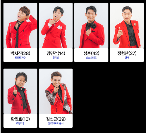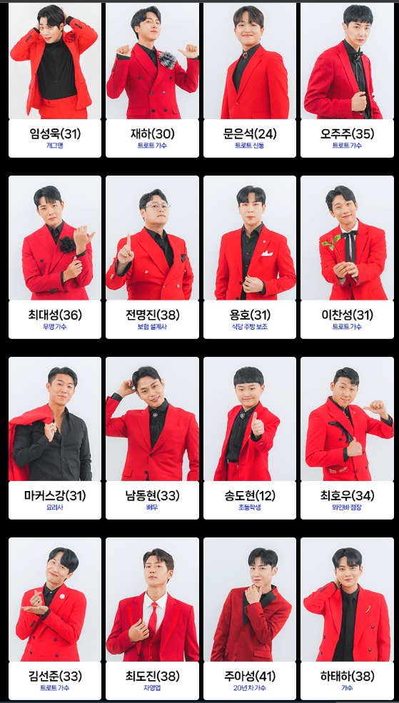 첫 1회부터 나왔던 참가자들입니다. 여기서 몇몇 분들은 탈락을 하셨고 많은 분들이 현재 오디션을 진행 중에 있습니다. 참가자는 아래와 같고 순서는 랜덤입니다.