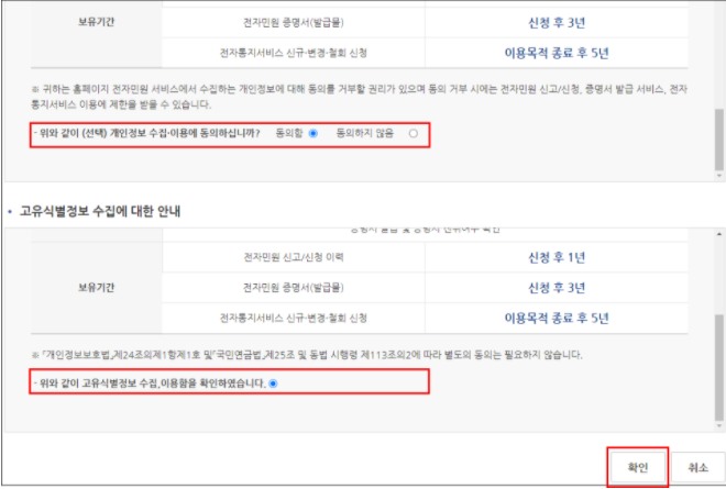 개인정보 수집 및 사용, 고유식별정보 수집 안내에 동의 체크 후 확인 클릭.