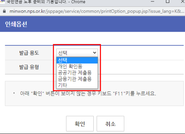 개인 확인용 / 공공기관 제출용 / 금융기관 제출용 / 기타 란이 있다.